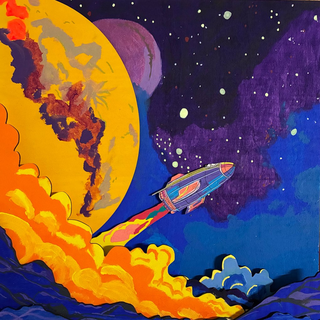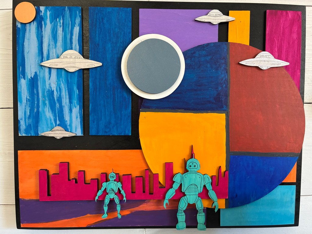 I’ve been experimenting with combining laser engraving and watercolor on basswood while working on some retro-futurism robot designs.